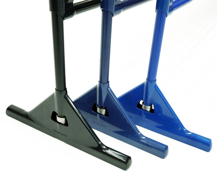 設置や撤去が容易にできます。錆に強く雨天時も使用できます。脚部は角度が「90°固定」と「フリー」を任意で設定できる、倒れにくいスタンド。収納時には平面で管理できスペースを取りません。